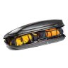 Система двухстороннего открывания облегчает доступ к грузу в боксе. Ребра жёсткости на днище бокса полностью снимают эффект скручивания. Подъёмные штанги облегчают открывание крышки бокса и одновременно спроектированы так, что надёжно фиксируют крышку в закрытом состоянии. Идеальная геометрия крышки и днища даёт плотное прилегание, что не позволяет проникать грязи и пыли в грузовое пространство, а также обеспечивают лёгкое запирание/отпирание замка. П - образные крепежи - простые и надёжные, бокс устанавливается на багажные поперечины не более чем за 15-20 минут. В комплекте крепежа также присутствуют ремни для крепления грузов.
